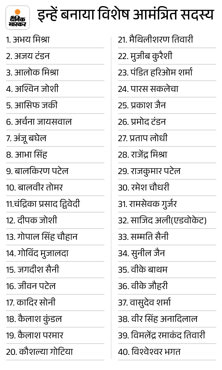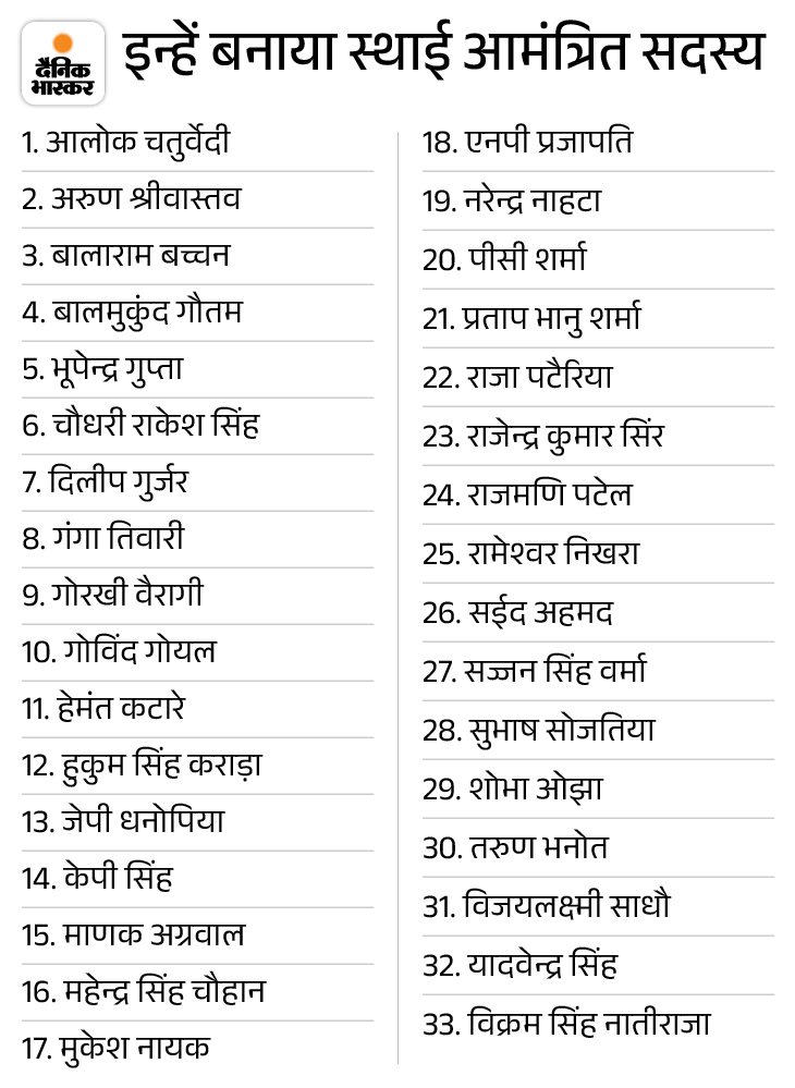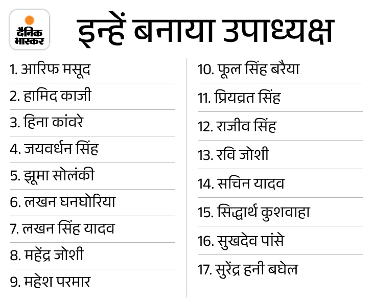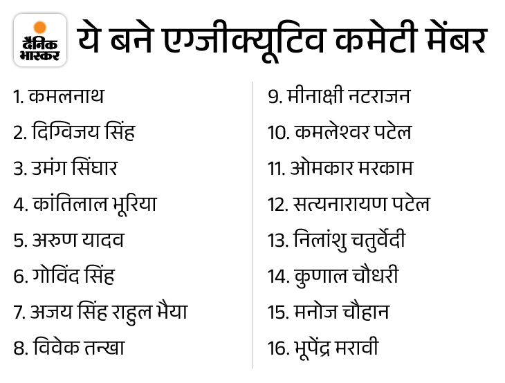 कमलनाथ और दिग्विजय सहित 16 कार्यकारिणी सदस्यों में से एक वरिष्ठ नेता को नियुक्त किया गया। टीम में पूर्व सीएम कमल नाथ, पूर्व सीएम दिग्विजय सिंह, नेता प्रतिपक्ष उमंग सिंघल, पूर्व केंद्रीय मंत्री कांतिलाल भूरिया, पूर्व केंद्रीय मंत्री अरुण यादव और पूर्व नेता प्रतिपक्ष गोविंद शामिल हैं।・श्री सिंह, पूर्व नेता प्रतिपक्ष अजय सिंह और राज्यसभा सांसद विवेक शामिल हैं। तन्हा. , पूर्व सांसद मीनाक्षी नटराजन, पूर्व मंत्री कमलेश्वर पटेल, पूर्व मंत्री ओमकार मरकाम, पूर्व विधायक सतीनारायण पटेल, पूर्व विधायक नीलांशु चतुर्वेदी, पूर्व विधायक कुणाल चौधरी, मनोज चौहान, भूपेन्द्र मरावी।