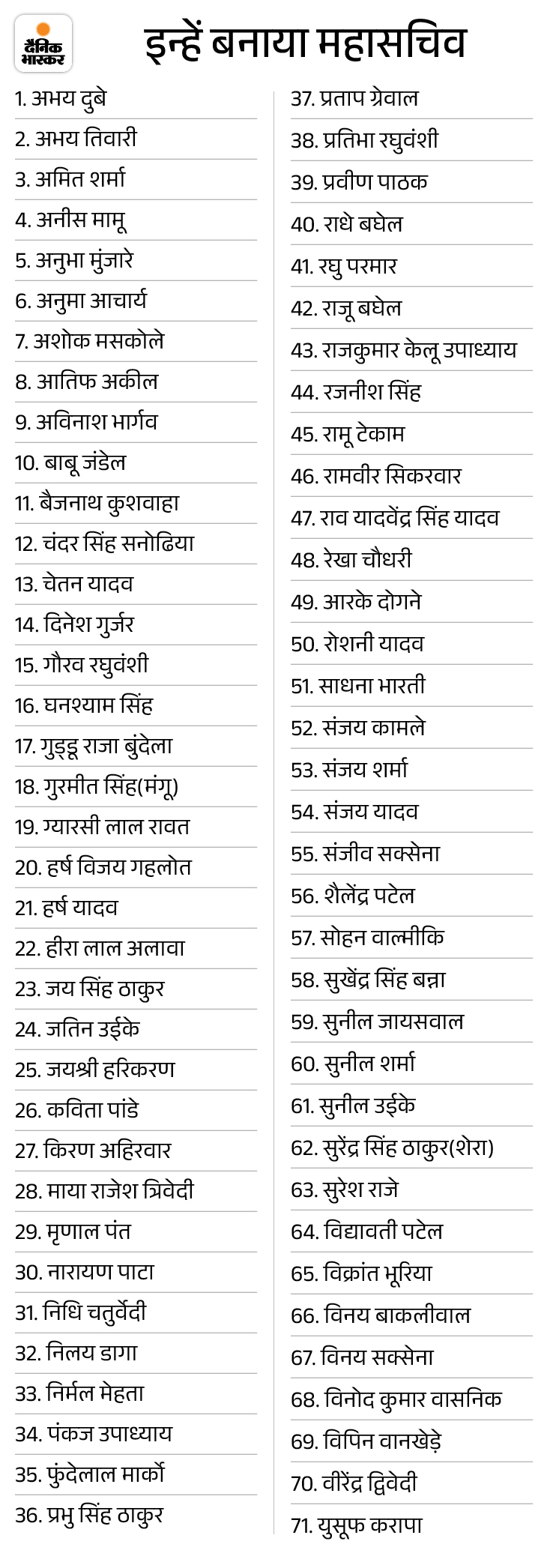 मध्य प्रदेश कांग्रेस के 177 सदस्यीय नेतृत्व की घोषणा हो गई है. राज्य विधानसभा अध्यक्ष का पदभार संभालने के लगभग 10 महीने बाद घोषित जीतू पटवारी की टीम में 17 उपाध्यक्ष, 71 महासचिव, 16 कार्यकारी, 33 स्थायी अतिथि और 40 विशेष स्टाफ सदस्य शामिल हैं।