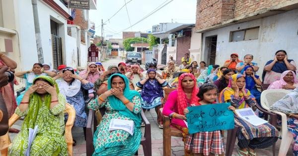 लखनऊ: पंतनगर की महिलाओं ने आंख, कान और मुंह बंद कर गांधीगिरी का विरोध किया